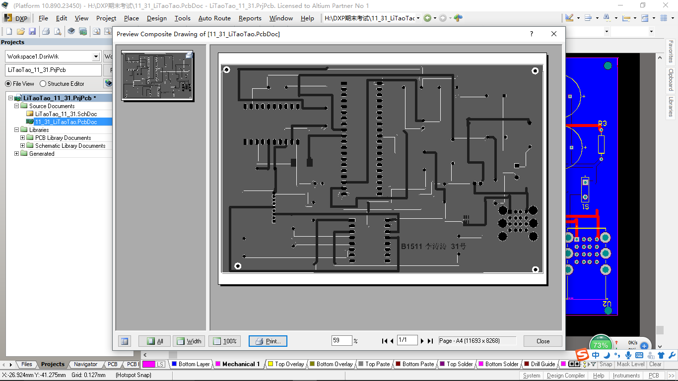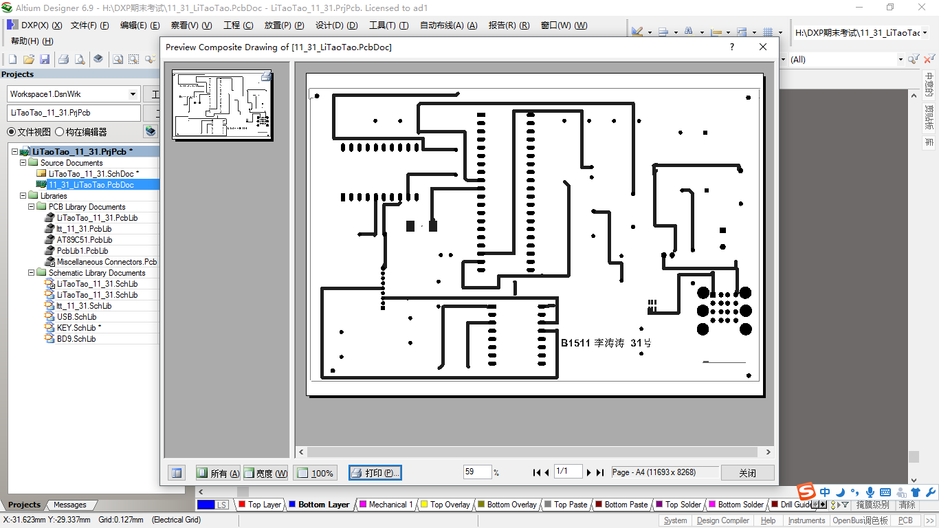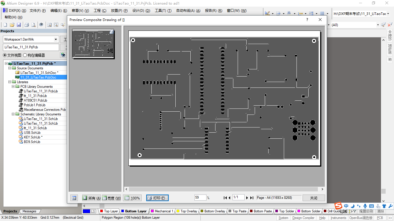 (5) 给pcb图敷铜,完成画板,并输出打印预览。