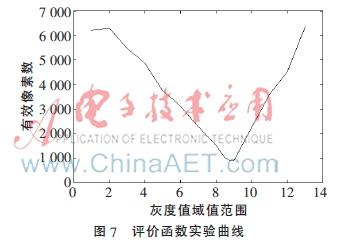 当像素灰度值在域值时,n(x,y)值取1,否则其值取0。图7为实验函数曲线,可以看出,该函数具有处理速度快、单调性好、峰值明显的优点,适合本系统的应用。