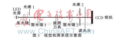 视觉系统主要由光源和成像系统组成。LED光源是一种冷光源,具有可见光强度高、无热量、无阴影、可无极调节等优点,仪器和刀具不会产生热变形而影响测量精度,且能耗低、体积小、寿命长,因此选取波长为0.68 μm的红色LED作为照明光源[3]。