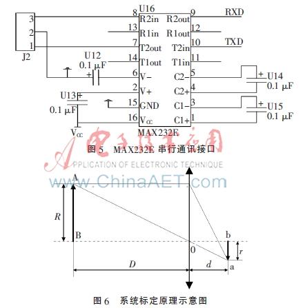 RS-232接口是一种串行总线接口,其串行通信接口如图5所示。由MAX232E执行电平的转换。MTC12C5A60S2单片机串行数据接收端RXD与MAX232E的输出端R2out相连接,串行数据发送端TXD与输入端T2in相连接。