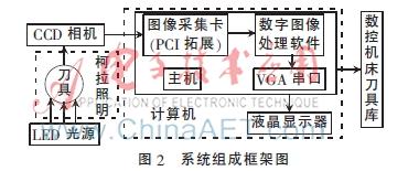 数字图像刀具测量系统整体的结构设计如图2所示。该系统由CCD数码相机、图像采集卡、计算机及其外设等硬件设备和数字图像处理软件共同组成[2]。