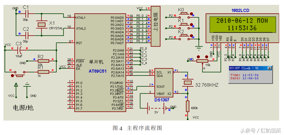 DS1307是一款具有I2C总线接口的实时时钟芯片,要驱动具有I2C总线接口的DS1307芯片,一种办法是选择一款带有I2C总线接口的高档单片机,然而,在很多小型仪器仪表中以及在单片机的教学环境中,使用带有I2C总线接口的高档单片机在经济上是不合算的,在这种情况下,可以采用I2C总线虚拟技术,选用普遍使用的51单片机,利用单片机的通用I/O端口模拟实现I2C总线接口。