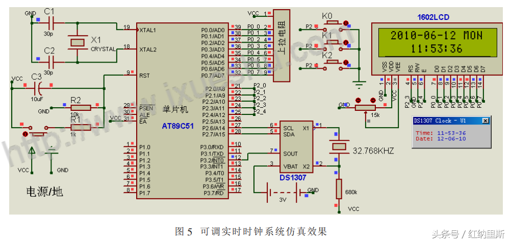 本文最后使用Proteus软件对本实时时钟系统进行仿真,将代码下载到单片机当中并启动Proteus后,液晶显示器与DS1307时钟显示模块同时显示初始时间并开始计时, 适当调节三个独立按键 K0~K2 后,液晶显示器显示调整后的 时间并且把新的 时间写入DS1307,DS1307 从新的时间开始计时。 仿真效果如图5 所示。