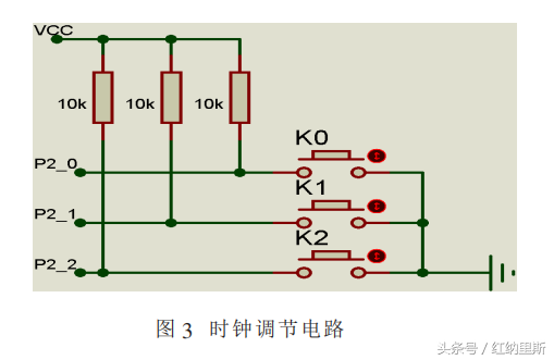 为了能够及时对时间进行调节,本系统设计了时钟调节电路,由K0、K1、K2三个按键组成,且分别由单片机的P2.0、P2.1和P2.2口控制。其中,K0做为时钟调节的菜单键,第一次按下表示可以调节时间秒,第二次可以调节时间分,第三次按下调节时,第四次按下退出调时菜单,时钟继续开始走动。K1和K2分别是时分秒调节的加减键。在本电路中,根据经验总结,额外添加三个上拉电阻,以保证在没有按键按下时,进入单片机三个I/O口的按键均处于高电平状态,防止干扰产生。时钟调节电路如图3所示。