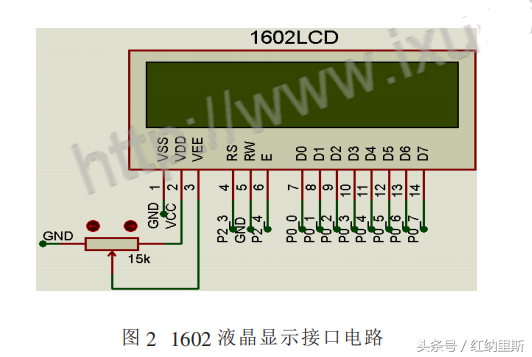 为了将系统时间实时显示出来,本系统没有采用常用的数码管作为显示方式,而是采用1602LCD液晶实时显示时间,这样电路的设计就会相对简单一些,所用到的I/O口也较少。1602液晶的接口电路如图2所示。
