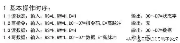 在这里我们以液晶1602为例,分析其操作时序。其基本时序有读状态,写指令,读数据和写数据。