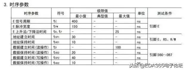 7、时间的标注,也是个十分重要的信息,这些时间的标注表明了某些状态所要维持的最短或最长时间。因为器件的工作速度也是有限的,一般都跟不上主控芯片的速度,所以它们直接之间要有时序配合。下面是时序参数表: