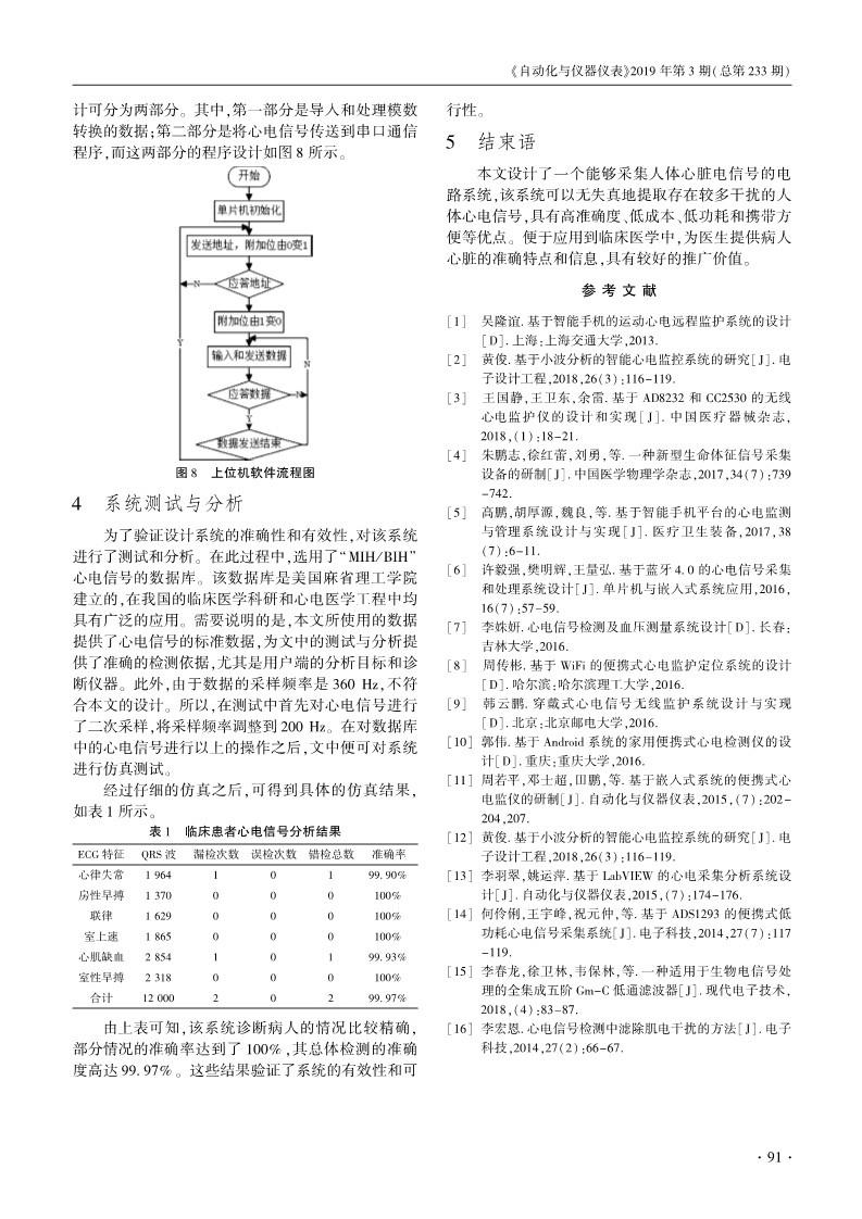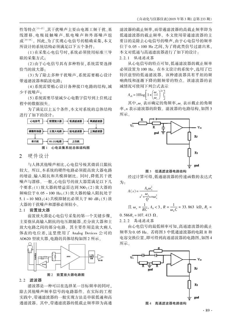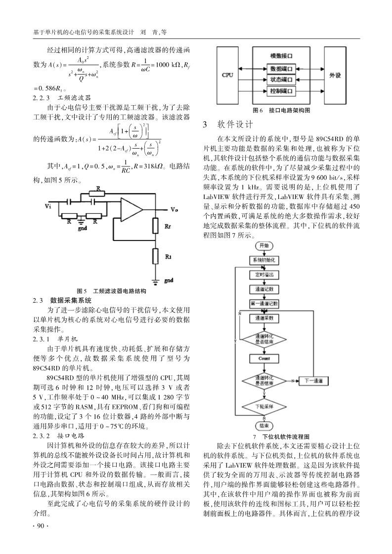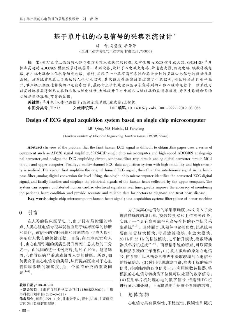 摘 要:针对医学上微弱的人体心电信号难以被获取的问题,文中使用AD620信号放大器、89C54RD单片机和高速的ADC0809模数信号转换器等一系列设备,设计了心电放大电路、带通滤波器、陷波电路、模数转换电路、单片机电路和上位机等组成电路。最终,实现了一个具有高可靠性和高安全性的多路心电信号的数据采集系统。该系统首先放大了原始的人体心电信号,其次使用带通滤波器过滤了干扰信号,模数转换进行电平抬升,单片机识别经过转换的心电数字信号,最终由上位机处理和显示采集得到的人体心脏的电信号。该系统可以实时地采集得到无失真的人体心脏电信号,大幅提升了对于病人心脏状况的监测准确度,为医生诊断和医治心脏病提供准确、可靠的数据。