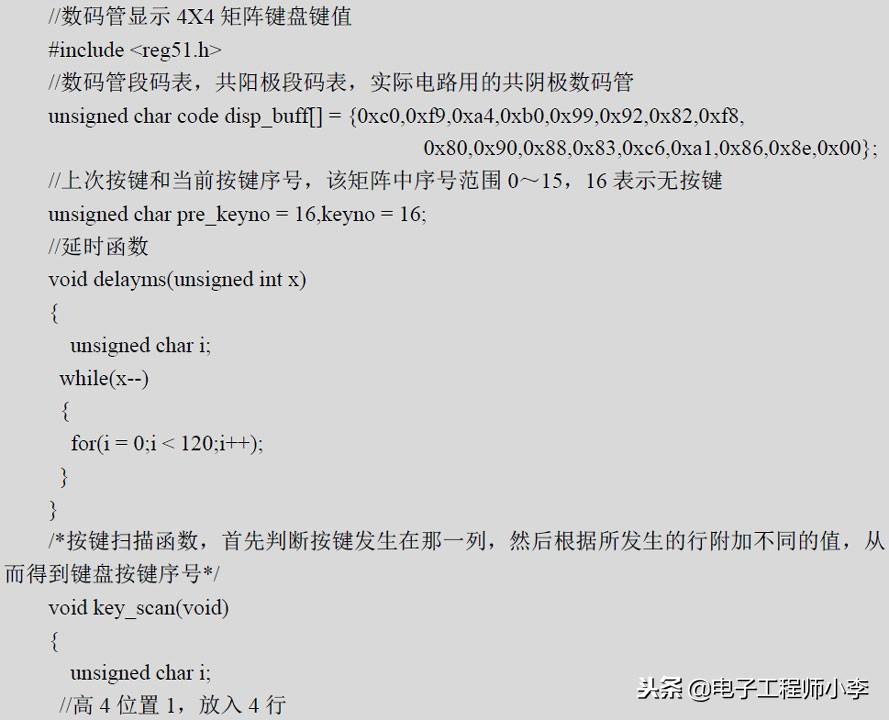 为了能让大家更为直观的理解矩阵键盘的扫描原理,本例的代码非常详细的列出了整个矩阵键盘的行列扫描过程,没有采用更简洁的编程方法。