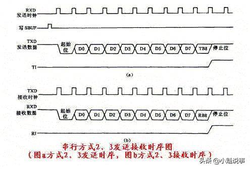 11位异步通信方式。其中,1个起始位(0),8个数据位(由低位到高位),1个附加的第9位和1个停止住(1)。方式2和方式3除波特率不同外,其它性能完全相同。方式2,3的发送、接收时序见下图。