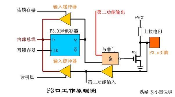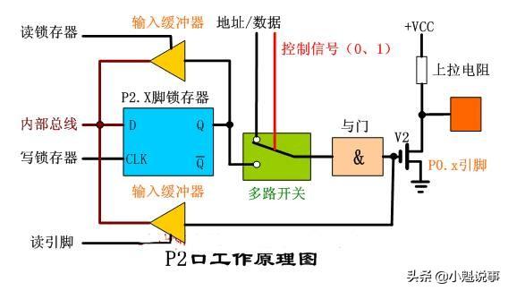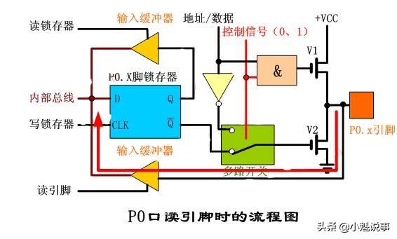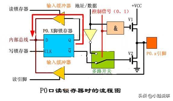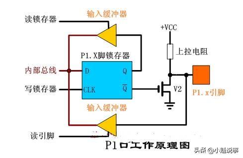 读芯片引脚上的数据,读引脚数时,读引脚缓冲器打开(即三态缓冲器的控制端要有效),通过内部数据总线输入,请看下图(红色简头)。