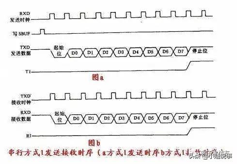 一条写SBUF指令就可启动数据发送过程。在发送移位时钟(由波特率确定)的同步下,从TxD先送出起始位,然后是8位数据位,最后是停止位。这样的一帧10位数据发送完后,中断标志TI置位。