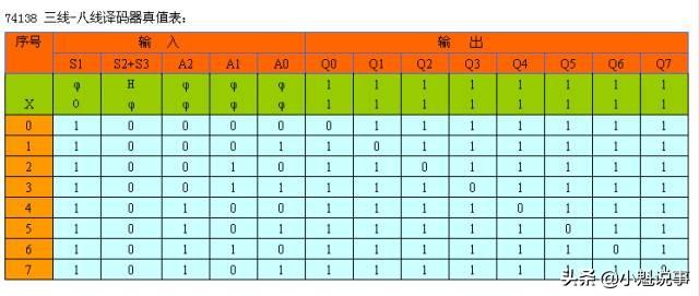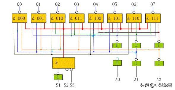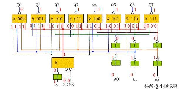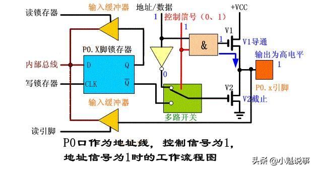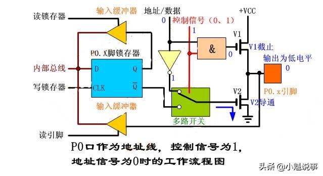 例如:控制信号为1,地址信号为“0”时,与门输出低电平,V1管截止;反相器输出高电平,V2管导通,输出引脚的地址信号为低电平。请看下图(兰色字体为电平):