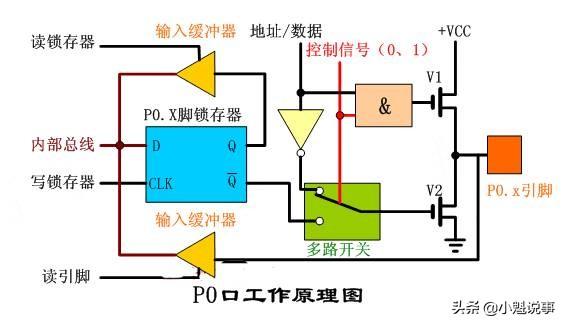 P0口作为I/O端口使用时,多路开关的控制信号为0(低电平),看上图中的线线部份,多路开关的控制信号同时与与门的一个输入端是相接的,我们知道与门的逻辑特点是“全1出1,有0出0”那么控制信号是0的话,这时与门输出的也是一个0(低电平),与让的输出是0,V1管就截止,在多路控制开关的控制信号是0(低电平)时,多路开关是与锁存器的Q非端相接的(即P0口作为I/O口线使用)。