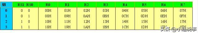 在00H—1FH共32个单元中被均匀地分为四块,每块包含八个8位寄存器,均以R0—R7来命名,我们常称这些寄存器为通用寄存器。这四块中的寄存器都称为R0—R7,那么在程序中怎么区分和使用它们呢?聪明的INTEL工程师们又安排了一个寄存器——程序状态字寄存器(PSW)来管理它们,CPU只要定义这个寄存的PSW的D3和D4位(RS0和RS1),即可选中这四组通用寄存器。对应的编码关系如下表所示。惹程序中并不需要用4组,那么其余的可用做一般的数据缓冲器,CPU在复位后,选中第0组工作寄存器。