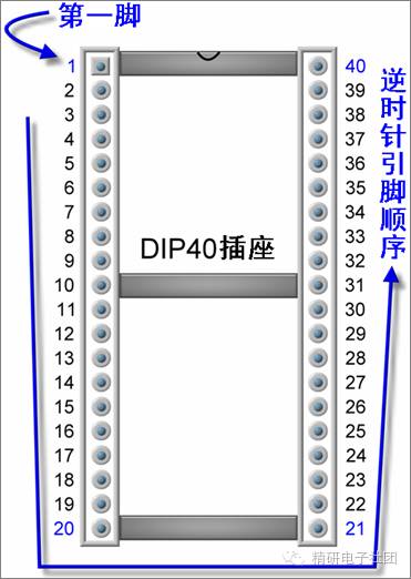 ·单片机缺口标记的左上方为1号引脚,逆时针排列为1~40引脚;