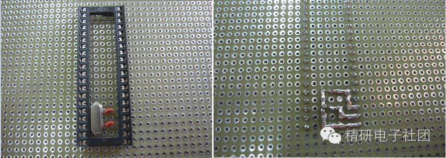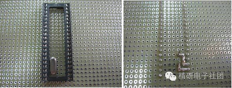 4. 将晶振放置于IC插座内,并与16、18号脚平齐,离板面一两毫米。