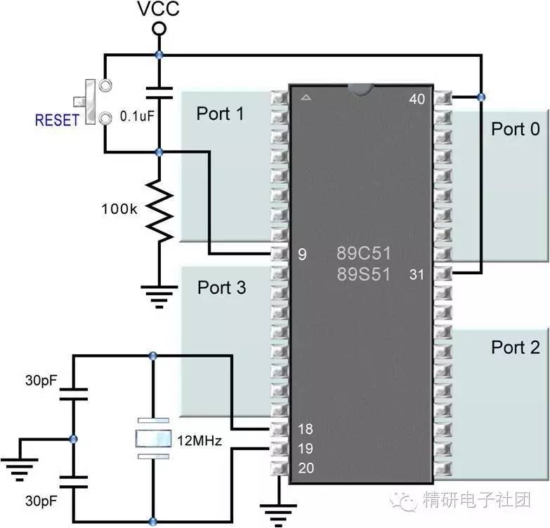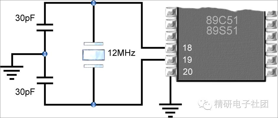 时钟电路由晶振CYS和电容C1与C2组成。单片机的时钟频率取决于晶振CYS的频率。电容器C1与C2的取值范围为30~50pF。时钟电路采用晶振的目的是提高时钟频率的稳定性。51单片机最小系统晶振CYS可以采用12MHz、11.0592MHz、6MHz等,在正常工作的情况下可以采用更高频率的晶振,51单片机最小系统晶振的振荡频率直接影响单片机的处理速度,频率越大,处理速度越快。也可使用外部时钟脉冲产生电路,但很少这样用。