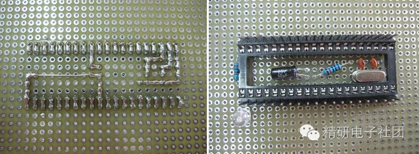 6. 将瓷复位电路里的电阻和电解电容放置于IC插座内,注意电解电容的极性,负极和插座的9脚平齐。焊接好的复位电路,将电解电容的负极和9脚还有电阻相连,电阻的另一脚和地线相连(即40脚)。