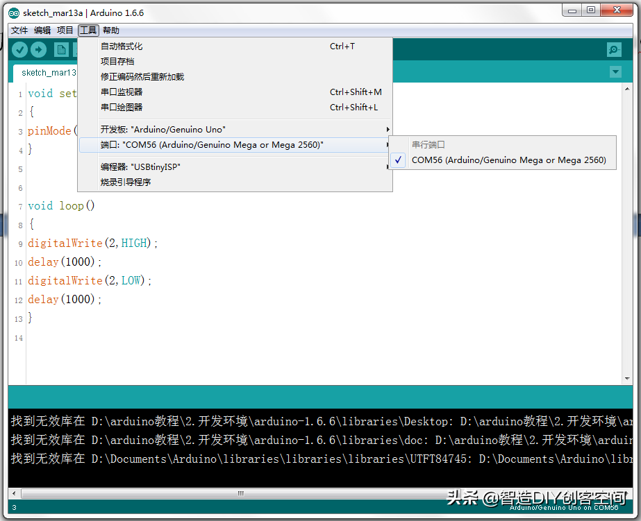 在编写好程序时候,我们可点击“√”图标先进行“编译/校验”,看看程序中是否存在“语法错误”。点击“√”后,系统会弹出一个“保存”对话框,我们可以根据自己的需要设置保存的位置以及工程文件的名称,注意文件名称中不能出现汉字及标点符号。如果程序正确无误,则可以用USB线连接板和电脑,如果USB转串口驱动安装正确,我们可以在“工具”栏的下拉菜单中看到“com”口,这里要注意的是,如果在电脑上连接了多个串口设备,一定选对com口,才能烧录程序。同时,在“工具”的下拉菜单中我们还应该正确地选择好“开发板类型”,如果是用的UNO板则选择UNO板,如果是NANO则选择NANO,如果选择的版型与连接的版型不一致,程序无法烧录。以上两项都选择好后,则可以点击“√”旁边的“→”,此时系统会再次对程序进行编译校验,然后再烧录。