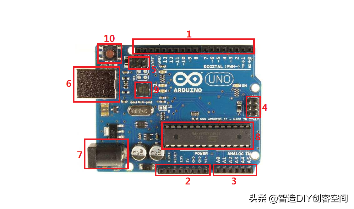 在学习的开始阶段,我们应该对开发板有一个总体的认识,才能保证后面的学习顺利进行。接下来以较为常用的UNO板为例展开介绍,图中以红色框标注了各个需要认识的部分,并标注了数字编号,下面按编号对UNO板进行介绍。