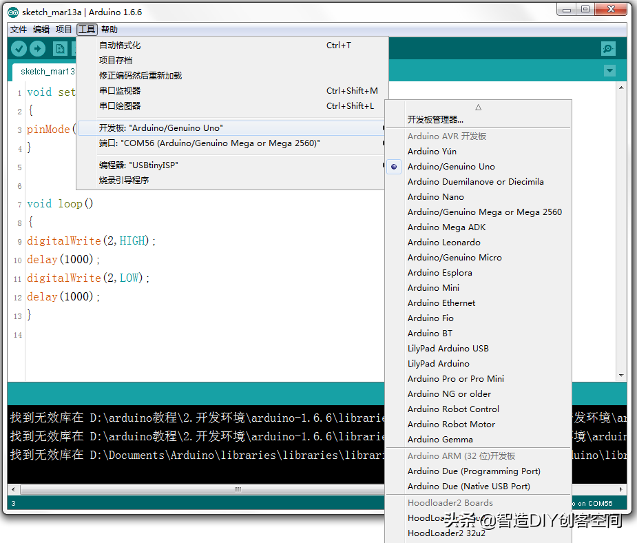 经过以上准备,就可以进入Arduino的入门仪式:点灯仪式—点亮一个LED。