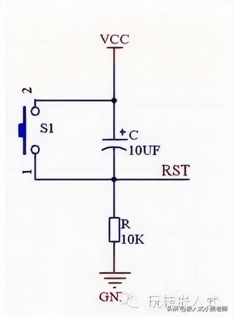 上电瞬间,由于电容两端的电压不能发生突变,所以电容两端的电位都是GND,即RST是低电平,而随着VCC通过RC电路对电容充电,当电容两端的电压达到VCC时,RST的电平为高电平,单片机正常工作。