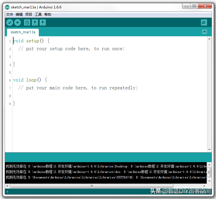 界面中空白的部分就是我们编写代码的区域,每次打开或新建一个文件,我们都能看到如图中一样的“模板”。从模板中可以看到,每个程序工程包含两大部分(函数):setup和loop。这两大块是不能多也不能少的,其中setup就是“初始化”,我们把程序中只需要执行一次的初始化代码放在里面,如引脚模式配置、串口启动及波特率设置等这些操作只需要执行一次。也就是说setup里面的代码,只有复位后或是上电后执行一次,随后则进入到loop中。而loop就是“大循环”,在它里面的代码会不停地循环执行,直到断电或按下复位键。setup及loop构成了一个主程序。