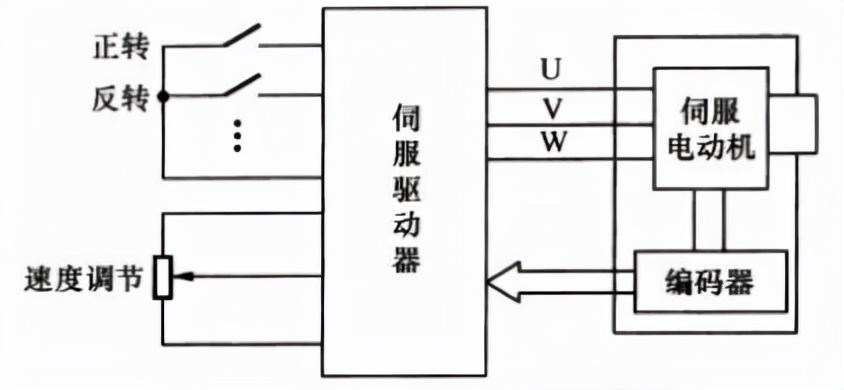 当交流伺服系统工作在速度控制模式时,伺服驱动器无需要输入脉冲信号也可以正常工作,故可以取消伺服控制器,此时的伺服驱动器类似于变频器,但是由于驱动器能够接收伺服电动机的编码器送来的转速信息,不但能够调节电动机的转速,还能够让电动机转速保持稳定。