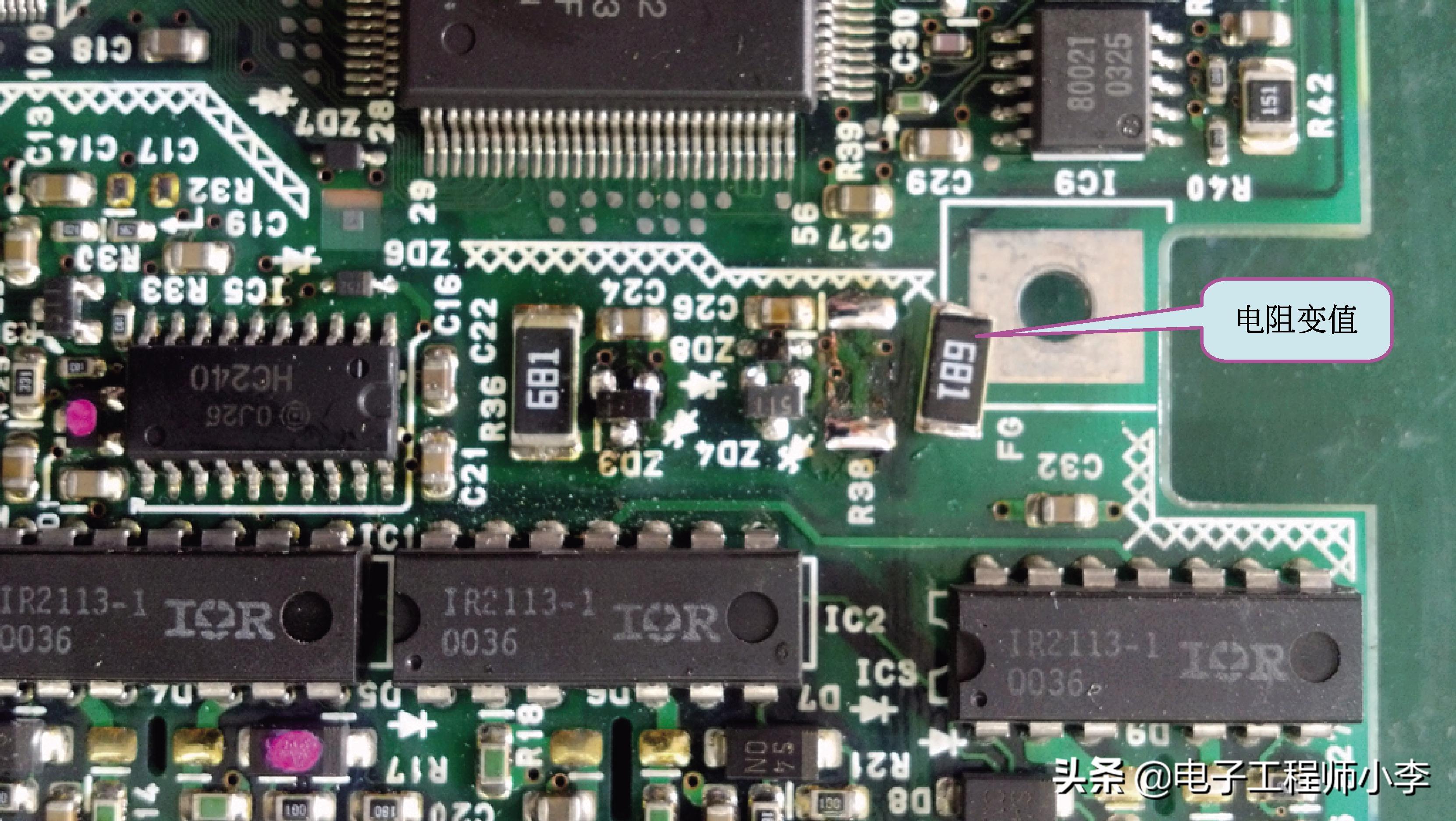 万用表测试了上下桥的各驱动管,正常,测试了所有电阻都正常,更换了所有IC,故障依旧,至此维修陷入困境,无奈向用户讨要另一块好板遂将两块相同的电路板(一块坏板,一块好板)通上24VDC电压,电流都是70mA左右。测试各点直流静态对地电压,发现坏板某节点同好板电压不一样,好板有10V,坏板只有2.1V,此节点有一个340kΩ的上拉电阻,电阻上端接24V,下端连接0.1μF的小电容到地,坏板此节点电压如此之低,怀疑小电容漏电,拆下小电容,检查并无明显漏电,遂将其更换,节点电压恢复10V。交用户试机,驱动器力矩恢复正常。