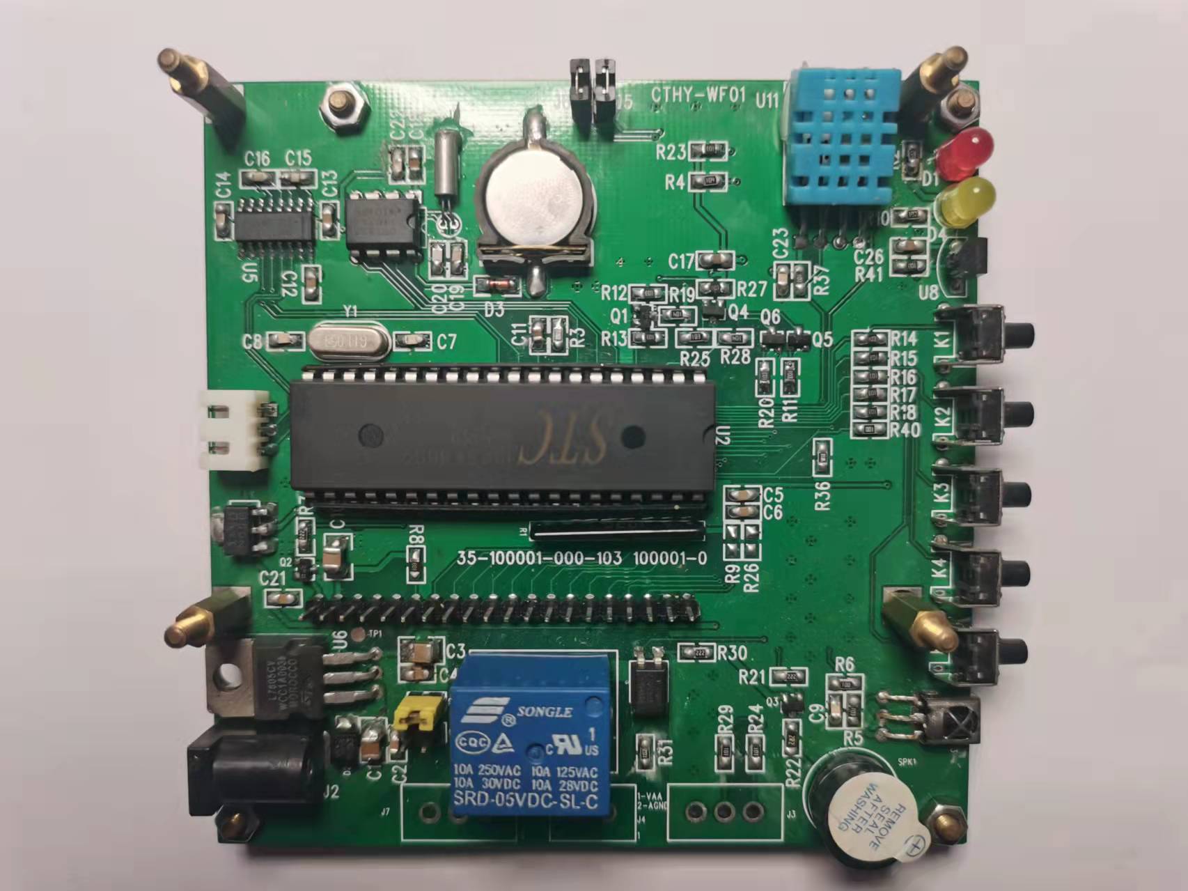 AC220V转DC9V适配器1个;线性稳压器:7805P 1个;单片机:STC12C5A60S2 1个;时钟芯片:DS1302时间芯片1个;温湿度传感器:DHT11,1个;蜂鸣器:1个;继电器:1个;LCD12864,1个;WIFI模组:ESP8266 1个;红外接收模块:1个;电路板及效果图照片: