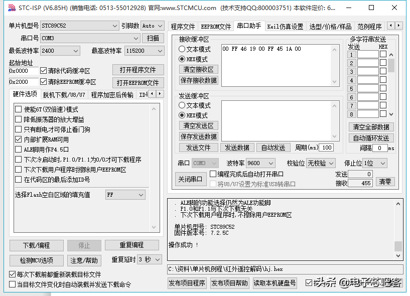 最后我们在主函数部分调用之前的函数,并且在等待解码完成后将解码出来的4字节数据通过串口发送到电脑。最后我们看一下实际的效果,首先打开串口助手,波特率设置为9600,接收设置为HEX模式,这样当按下红外遥控器的按键时,就会返回遥控器的键值了,
