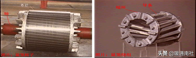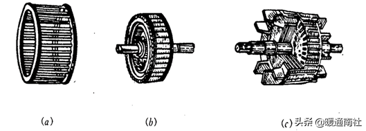 如果用的是铜料,就需要把事先做好的裸铜条插入转子铁心上的槽里,再用铜端环套在伸了两端的铜条上,最后焊在一起,如图(b)所示。如果用的是铸铝,就连同端环、风扇一次铸成,如图(c)所示 。笼型转子结构简单、制造方便、是一种经济、耐用的电机,所以应用极广。