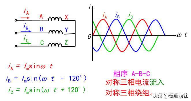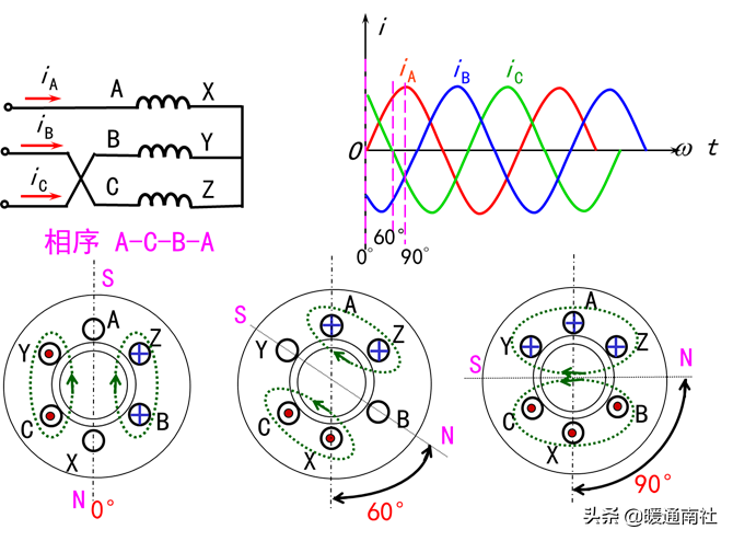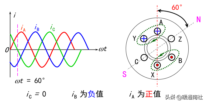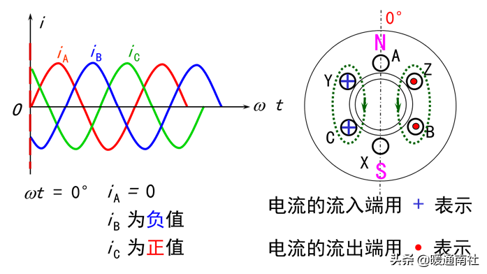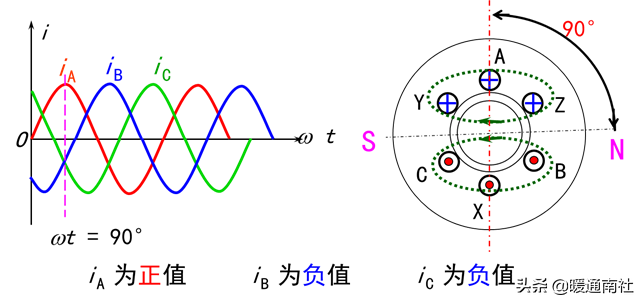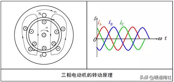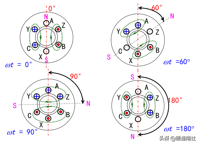 空间相差 120°角的三相绕组,通入对称三相电流时,产生的是一对磁极的旋转磁场,当电流经过一个周期变化时,磁场也沿着顺时针方向旋转了一周(在空间旋转的角度为360°)。