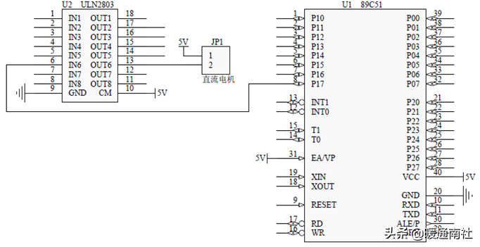 图8是使用TX-1C实验板做直流电机扩展实验时的硬件连接图,电机扩展板独立于TX-1C实验板,电机扩展板上使用5V直流电源,在做本实验时,两电源需要共地。电机扩展板上用一个达林顿反相驱动器ULN2803驱动电机,这里仅驱动一路电机,电机的一端接+5V电源,另一端接ULN2803的OUT6引脚,ULN2803的IN6引脚与单片机的P1.7相连,通过控制单片机的P1.7输出PWM信号就可控制直流电机的速度与启停。