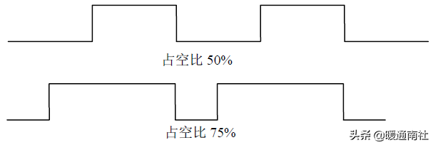PWM波:PWM是英文Pulse Width Modulation(脉冲宽度调制)的缩写,按一定规律改变脉冲序列的脉冲宽度,以调节输出量和波形的一种调制方式,我们在控制系统中最常用的是矩形波PWM信号,在控制时需要调节PWM波的占空比。如图所示,占空比是指高电平持续的时间在一个周期时间内的百分比。控制电机的转速时,占空比越大,速度越快,如果全为高电平,即占空比为100%时,速度达到最快。