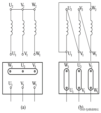 定子绕组是三相电动机的电路部分,三相电动机有三相绕组,通入三相对称电流时,就会产生旋转磁场。三相绕组由三个彼此独立的绕组组成,且每个绕组又由若干线圈连接而成。每个绕组即为一相,每个绕组在空间相差120°电角度。线圈由绝缘铜导线或绝缘铝导线绕制。中、小型三相电动机多采用圆漆包线,大、中型三相电动机的定子线圈则用较大截面的绝缘扁铜线或扁铝线绕制后,再按一定规律嵌入定子铁心槽内。定子三相绕组的六个出线端都引至接线盒上,首端分别标为U1, V1, W1,末端分别标为U2,V2, W2。这六个出线端在接线盒里的排列如下图所示,可以接成星形或三角形。