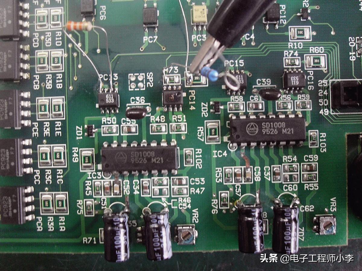 在用万用表电阻挡测量连接主控板排线端子旁边的电容时,发现有一个47μF的电解电容C4两端电阻只有60Ω,如图6.24所示。根据经验,一般的控制电路电源电容两端电阻至少有100Ω以上,连接的芯片很多时(几十个,而且总有密脚的大规模集成电路)才可能电源两端的电阻很小,如电脑主板3.3V两端通常在10Ω以下,但此板并无很多芯片,说明某处存在短路。观察此电容的连线走向,发现有一个运算放大器082C的正电源是由C4上的电压串联47Ω电阻R102后加到第8脚,R102明显有烧黑的痕迹,说明此电阻曾经通过的电流比较大。万用表在线测量其旁边的小贴片电容C10,只有10多欧姆,焊下C10再量其两端阻值为12Ω,已经短路,此时再量电解电容C4两端电阻为2.2kΩ。至此可以定位故障原因:C10短路把运算放大器082C的正电源电压拉低,从而使得电压检测电路出现错误,导致报警。取1个100nF 1206封装的贴片电容替换短路电容,并将R102(47Ω)更换,电路板修复成功。