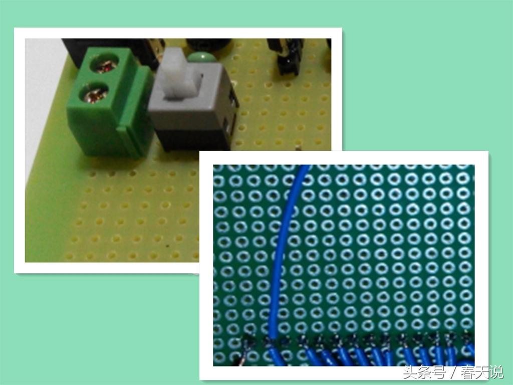 由于单片机STC15W408AS为贴片封装,大体积的只有SOP28封装,比较适合。我们在程序没有设计完成之前,没有必要专门制作PCB蚀刻电路板。用洞洞板的话先要解决贴片转直插的问题,用排针来转换。两排插针焊装在洞洞板上,把贴片封装的单片机管脚用细导线连接到插针上,如图所示: