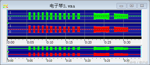 展开的音频信号已经不是标准的信号了,和示波器观察的差异很大,这可能使由于蜂鸣器的还原,以及声卡的转换,多种原因造成的,但是依然可以辨识到不同频率的音符。