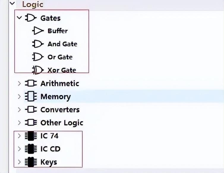 逻辑设备在组件选择的“逻辑”类别分组。有两种主要类型的组件:单组件和子电路。逻辑子电路被示出具有一个黑色的“芯片”的图标,而单个组分具有白色图标: