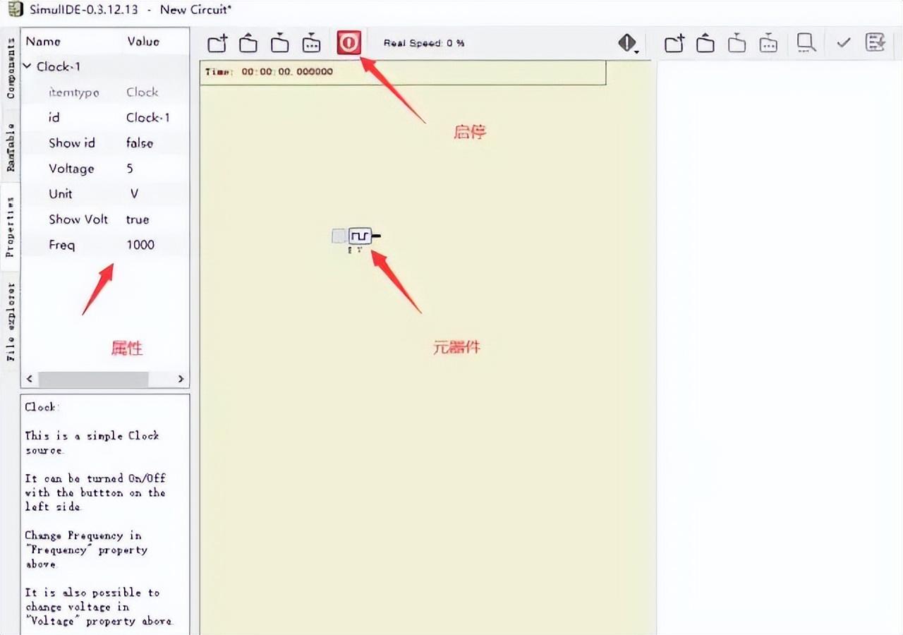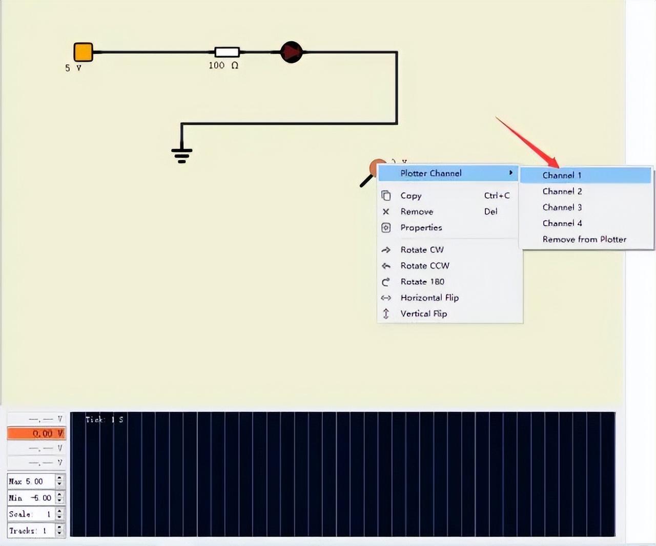 鼠标中键上的电路,并移动到任何空白部分滚动电路。MOUSE_WHEEL来放大 /缩小电路。-点击电线创建节点和初始化新线。-鼠标中键上线到动线。-左键点击组件和移动即可。右键点击,上下文菜单。-电源按钮来启动/停止模拟。2.仿真