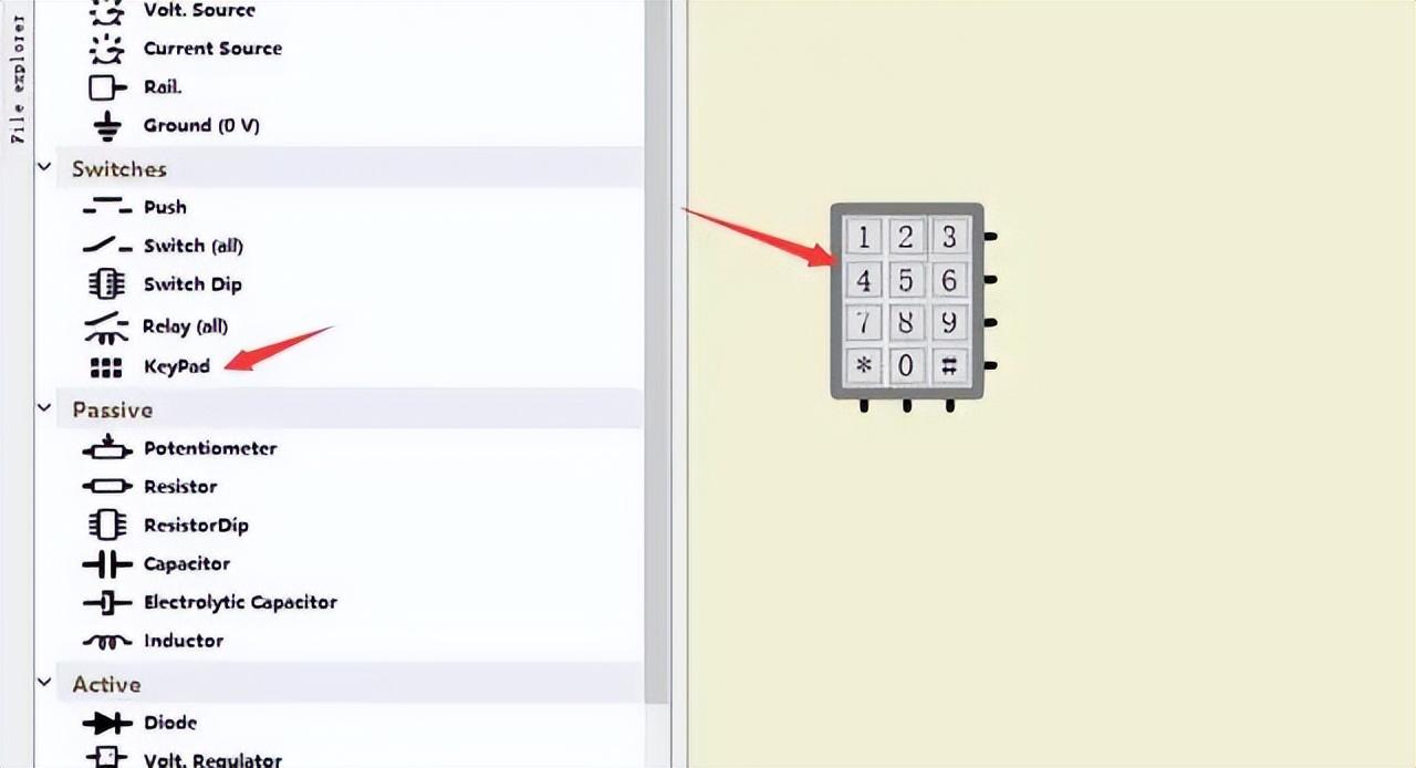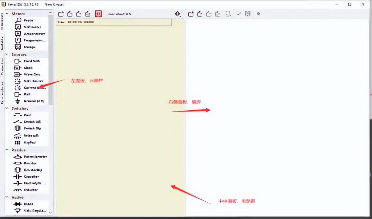电路图是中央面板,在这里你创建和模拟电路,这些都是你可以做的操作:-将组件从左面板- >组件选项卡上,拖放到电路,并通过点击引脚连接器创建。