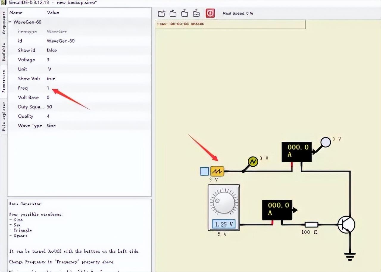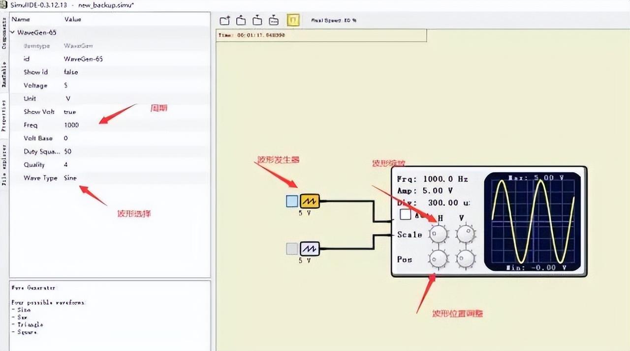 它可以产生正弦波,三角,锯齿和方波类型。wave type:波型,正弦波,三角波,锯或方形(默认正弦)。Freq:以赫兹波的频率(默认1000)。Volt Base:基本电压,默认为0伏。Volt:电压,默认为5伏。Quality:波质量(分辨率),在1至5级(默认4)。Duty Square:脉冲信号,方波占空比(默认值50)。