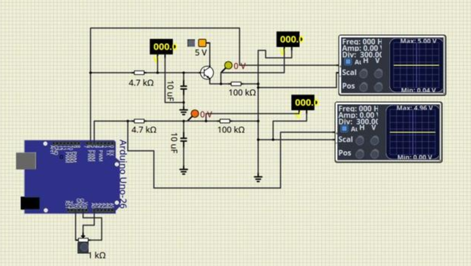 -中央面板(绘图,串口监听)与电路图和电路仪器-右侧面板与编辑/编译器/调试器。