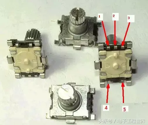 具有左转,右转,按下三个功能。4、5脚是中间按下去的开关接线 1 2 3脚 一般是中间2脚接地,1、3脚上拉电阻后,当左转、右转旋纽时,在1、3脚就有脉冲信号输出了。