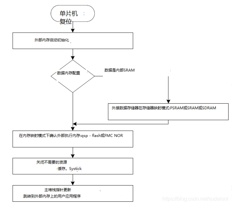 先从闪存复制用户应用程序二进制文件(SDCARD或SPI-Flash存储器)到外部SDRAM或外部SRAM,然后跳转执行用户应用程序。