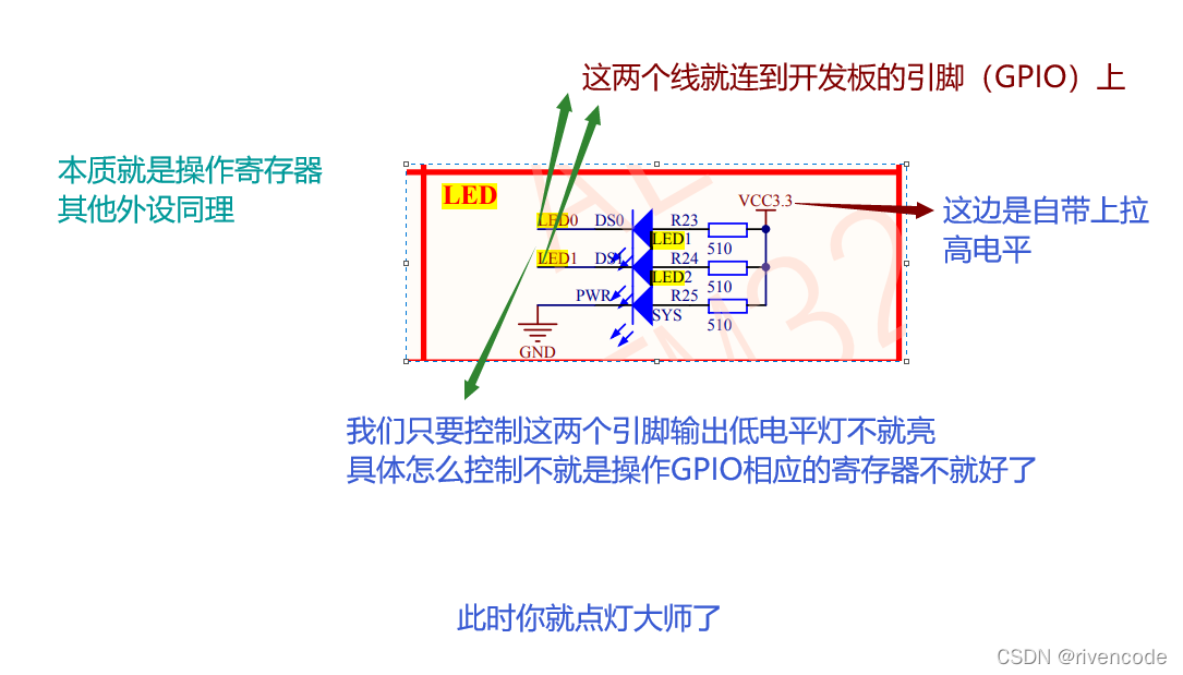 在 XX 外设的地址范围内,分布着的就是该外设的寄存器。以 GPIO 外设为例, - GPIO(general purpose input output)是通用输入输出端口的简称,简单来说就是 STM32 可控制的引脚 ,基本功能是控制引脚输出高电平或者低电平。最简单的应用就是把 GPIO 的引脚连接到 LED 灯的阴极,LED 灯的阳极接电源,然后通过 STM32 控制该引脚的电平,从而实现控制 LED 灯的亮灭。