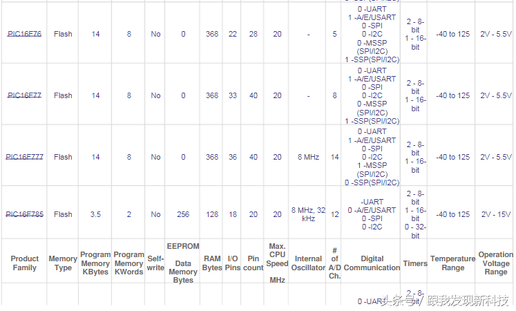 PIC12/PIC168位单片机片机选型列表