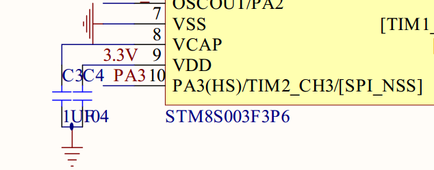 我们通常不会将VCAP直接接地,而是通过串联一个470nF的电容接地。它的作用是我们在进行SWIM模式下载时减小干扰。根据我们板子的封装,有时我们需要一对或两对特定的VDDIO/VSSIO来给I/O供电,在此我们用不到。